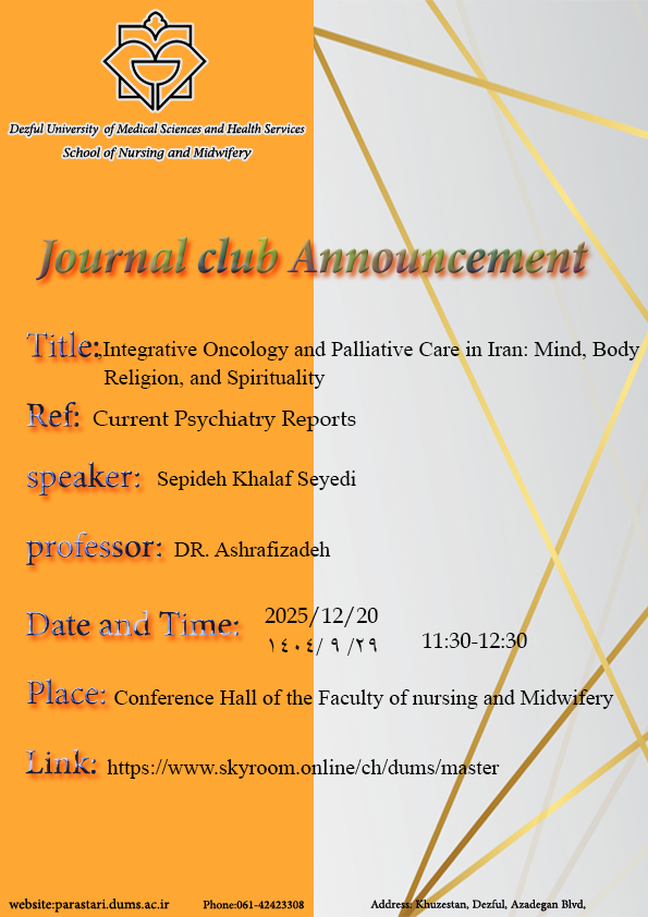 ژورنال کلاب دانشجویی مقطع تحصیلات تکمیلی در تاریخ 29 آذر 1404 به صورت حضوری و مجازی برگزار شد.در این جلسه،خانم سپیده خلف سیدی ، دانشجوی کارشناسی ارشد پرستاری داخلی جراحی، با راهنمایی خانم دکتر اشرفی زاده