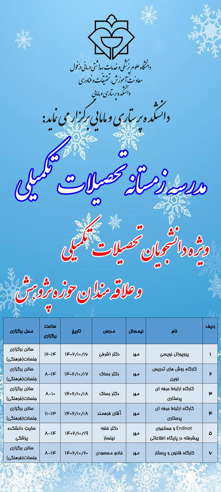 نخستین مدرسه زمستانه تحصیلات تکمیلی به مدت یک هفته از تاریخ 1402/10/16 لغایت 1402/10/20 در شش عنوان کارگاه کاربردی شامل: پروپوزال نویسی، روش های تدریس نوین، ارتباط حرفه ای پرستاری، end not و جستجوی پیشرفته در پایگاه اطلاعاتی و قانون و پرستار ویژه دانشجویان تحصیلات تکمیلی و کلیه علاقه مندان حوزه پژوهش در دانشکده پرستاری و مامایی در حال برگزاری می باشد.