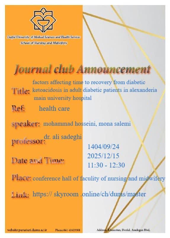 ژورنال کلاب دانشجویی مقطع تحصیلات تکمیلی در تاریخ 24 آذر 1404 به صورت حضوری و مجازی برگزار شد.در این جلسه،خانم مونا سالمی نسب و آقای محمد حسینی ، دانشجویان کارشناسی ارشد پرستاری اورژانس، با راهنمایی آقای دکتر صادقی مقدم