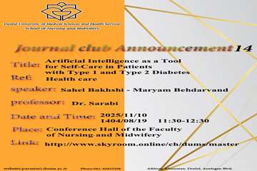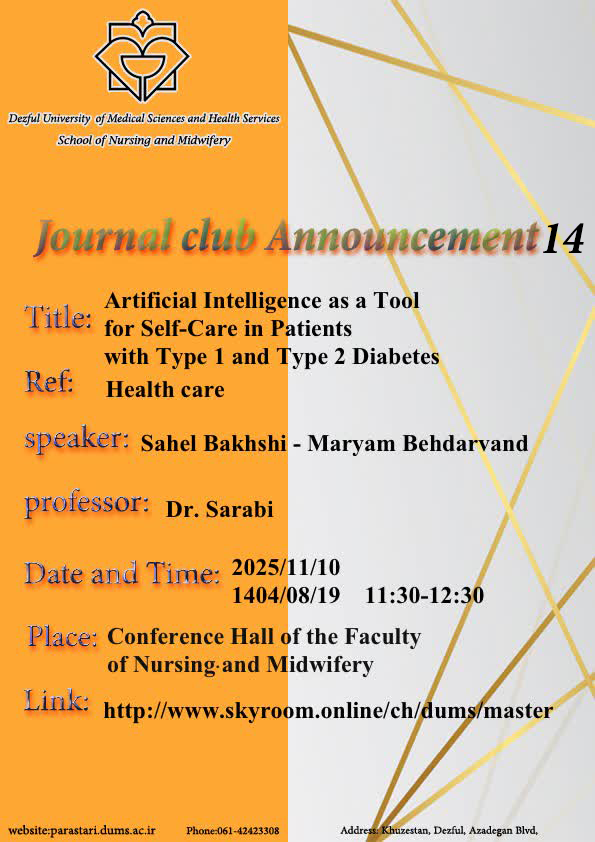 Artificial Intelligence as a tool for Self_Care in Patients with Type 1 and type2 Diabetes پرداختند. این جلسه با هدف ارتقاء توان تحلیلی دانشجویان در بررسی مقالات بین‌رشته‌ای و آشنایی با روش‌های نوین تحقیقاتی برگزار گردید، امید است که استمرار چنین برنامه‌هایی نقش مؤثری در رشد علمی و پژوهشی دانشجویان و اعضای هیئت علمی ایفا نماید.