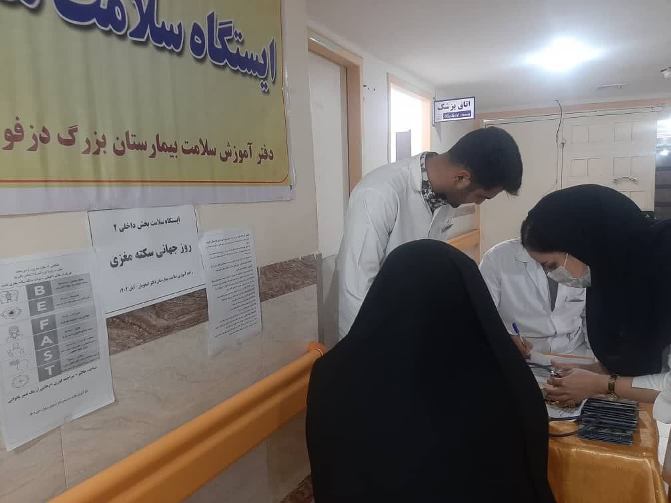 به مناسبت گرامی داشت روز جهانی سکته مغزی روز شنبه مورخ 1402/8/6 ایستگاه سلامت و آموزش در بیمارستان گنجویان دزفول برپاشد. در اجرای این برنامه دانشجویان اینترشیپ پرستاری با همراهی سرکار خانم حمیدی پور عضو هیئت علمی دانشکده پرستاری و مامایی، آموزش هایی جهت پیشگیری از سکته مغزی شامل سبک زندگی سالم، پیشگیری و کنترل فشارخون، ترک دخانیات، کنترل قندخون وچربی خون، فعالیت بدنی مناسب، تغذیه سالم و... به مراجعین ارائه نمودند و بین افراد پوستر و تراکت های علائم سکته مغزی، شناخت علائم و مراجعه حضوری به اورژانس نیز توزیع گردید.